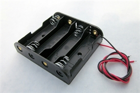Battery box for holding four AA batteries side by side. L x W x H = 68mm x 64mm x 19mm. (6v alkaline or 4.8v NiMh) ready-wired (14cm long wires, red and black)
