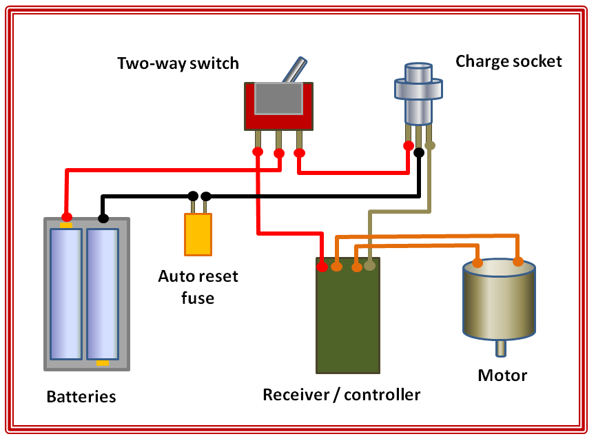 The positive lead (red) from the socket is connected through the switch and fuse to the positive terminal of the battery. The black (negative) lead is connected to the negative terminal of the battery. The grey lead is connected to the receiver/controller. When there is no plug inserted into the charge socket the receiver is connected to the negative supply. When a plug is inserted into the socket, the connection to the receiver is broken.