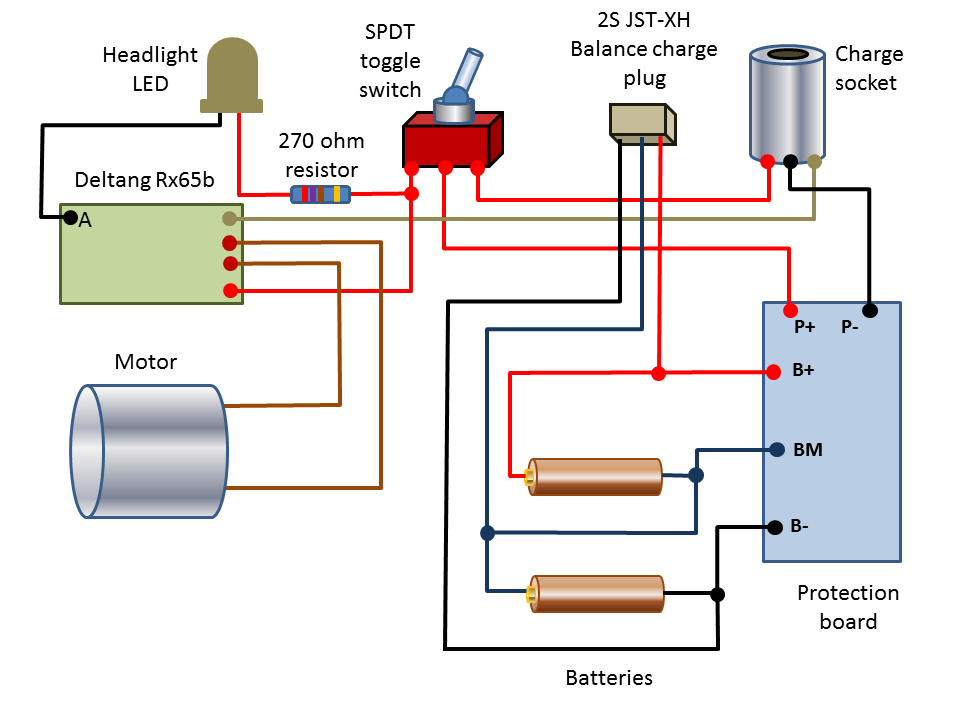 You will notice in the above diagrams that a balance charge plug has also been included in the circuit. It is advisable from time to time to balance-charge lithium-ion batteries in a pack to ensure that each cell is holding the same level of charge. If cells in the pack become unbalanced, then the pack will deteriorate and no longer hold its full charge. If the imbalance becomes acute then it could cause one or more of the cells to suffer catastrophic failure (ie your prize loco could go up in flames)